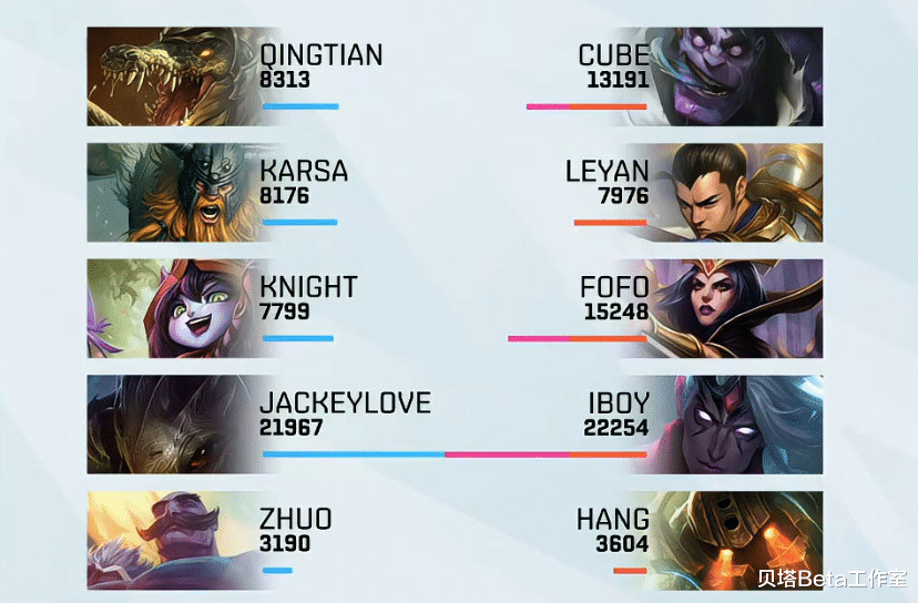 第二局TES上单鳄鱼,打野奥拉夫,中单璐璐,下路大嘴加布隆;RA上单梦多,打野赵信,中单妖姬,下路韦鲁斯加泰坦。前期乐言抓中,配合FoFo妖姬击杀了Knight的璐璐,RA拿下了一血,不过FoFo妖姬也被换掉,之后TES上野抓死了Cube梦多,随后iboy韦鲁斯在下路单杀晴天鳄鱼,前期RA经济领先2K。中期RA几波混战都是小胜,22分钟拿下了第一条大龙,之后利用大龙buff推进的时候,TES站位失误被开到,RA击杀了TES双C后,直接一波结束了比赛。第二局双方的输出如下,iboy的韦鲁斯打出了全场最高伤害,TES这边JKL的大嘴伤害最高。
