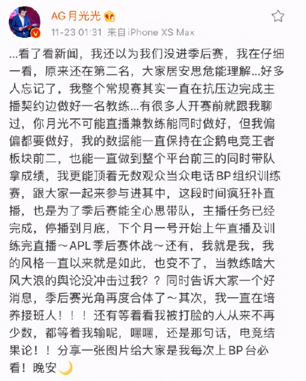 本赛季月光说过好几次减少直播频率,还有减少发WB的频率,一切以赛训为主。但是实际上月光还是每天都会直播,他自己不在的时候就找人代播,尤其是MC基本上成为了月光直播间的工具人,并且WB基本上每天都在发,也是唯一一个以现役主教练身份预测比赛的。APL一方面是给选手们打娱乐赛,另一方面也是给月光的直播间带来热度。月光想证明自己能兼顾直播和赛训,所以两方面投入的精力都很多,看上去也非常疲惫,他也表示这个月疯狂直播就是为了季后赛有更多的精力带队。