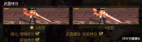 武器特效默认为最新的特效A类型,B类型为原来的老特效,不喜欢新特效的玩家可以在设置里面调整回老特效,也可以针对强化/增幅、武器属性/技能、锻造来分别进行设置。