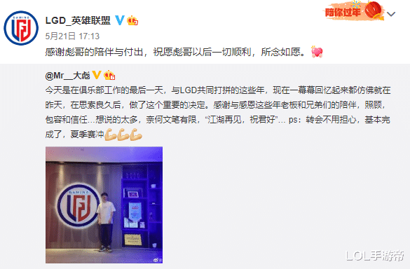 LGD宣布英雄联盟战队副经理彪哥与俱乐部解约,彪哥发的与俱乐部告别微博里,有提到LGD的夏季赛转会已经完成,让粉丝们不用担心。具体LGD夏季赛新增的人员是谁,暂时还不得而知。