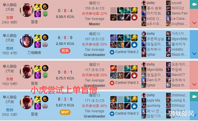 单线盲僧的强势之处,就在于对线换血方面,伤害吸血护盾爆发全部都有,而且加强了E技能清线能力也不弱,清完线就能配合游走支援,前期非常强势,当然了盲僧这个英雄如果拖到了后期,懂的都懂,就看那一脚操作。作为目前的版本宠儿,RNG上单选手小虎也在近期的韩服rank里在尝试单线盲僧,有打出好的效果,也有0-8的凄惨战绩!