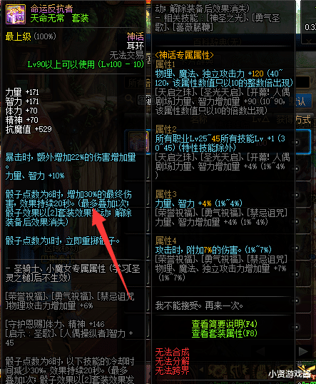 命运反抗者是天命无常套(赌狗套)的神话耳环,这件神话的装备和赌狗套一样属性是随机获得,就耳环来说属性比较特殊,除了增加22%额外黄字,10%的力智之外,30%的最终伤害需要通过摇骰子获得,只有少骰到点数为6的时候才会触发,而且需要每隔20秒才能重新摇一次,因此有新开传奇私服99玩家说摇到6最猛的神话,没摇到就是最垃圾的神话。