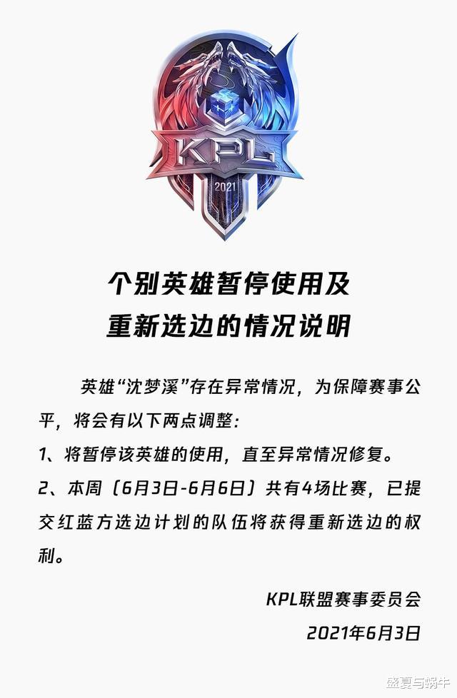 然而就在比赛开始之前,KPL官方公布了一则消息,AG粉丝看后倒吸一口凉气。原来近期官方发现英雄沈梦溪在比赛服出现了“异常情况”,具体是怎样的异常情况官方也没说。为了保证赛事的公平,官方决定暂停使用沈梦溪,直到异常情况被修复,并且6月3号至6号的四场比赛不能使用沈梦溪。沈梦溪被禁用对哪个战队的影响最大?答案无疑是成都AG超玩会。