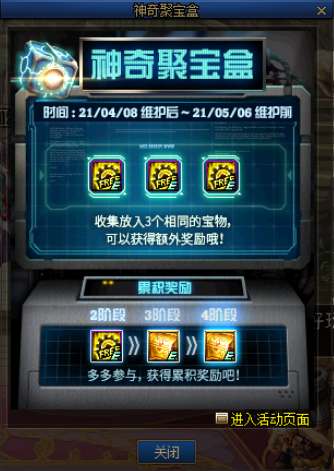 神奇聚宝盒,为全新的活动内容,该活动也比较有意思,有一点类似“老虎机”,只要玩家抽中“777”就可以获得大奖。而“777”代表的是3个相同的物品,除了会获得抽奖获得的奖励,还可以获得额外大奖。