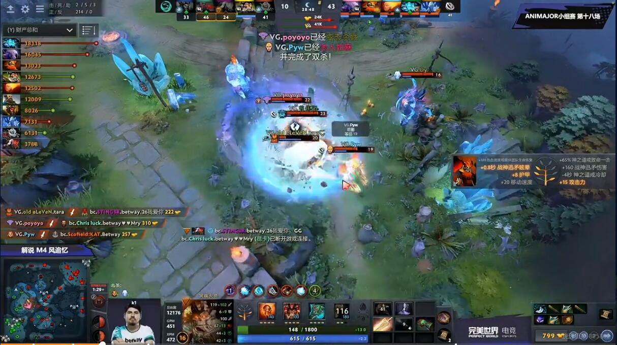 第二局VG选出了虚空假面和玛尔斯的双团控搭配远古冰魄的团战组合。对线期VG双辅助发挥良好取得了不小优势,拿到闪烁匕首的玛尔斯配合队友节奏起飞。19分钟VG打盾引诱bc接团,虚空假面加玛尔斯两大团控直接击溃bc,杀人控盾。后续bc再也组织不起来有效的防守,团战一击即溃,28分钟敲出GG。