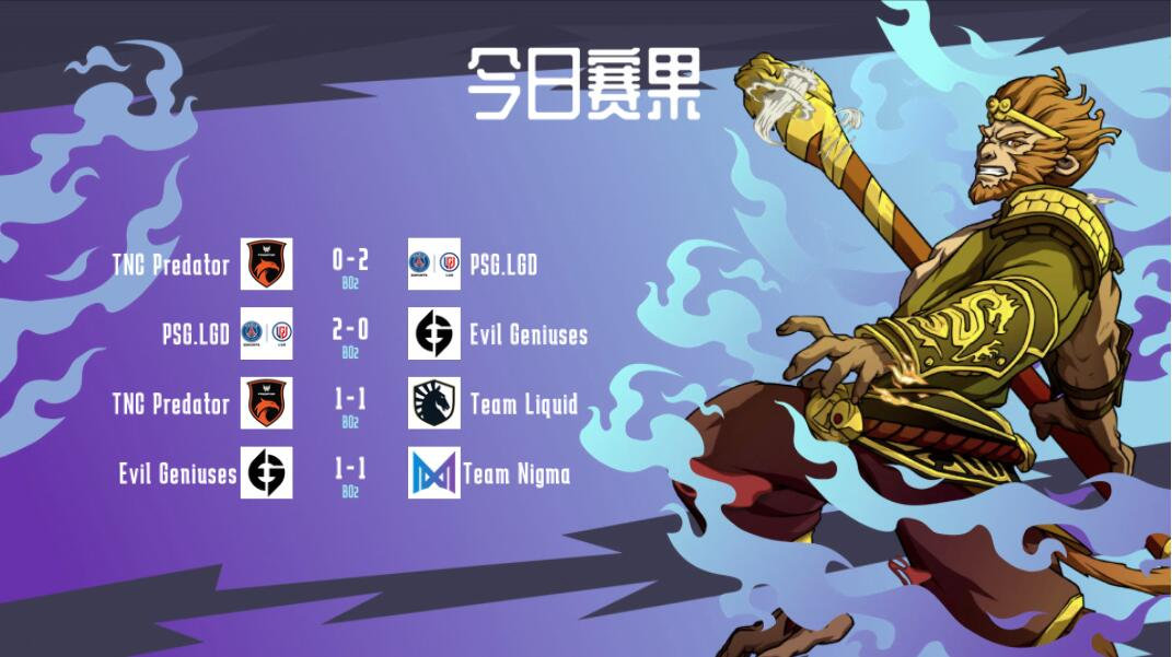 昨晚PSG.LGD连续两个二比零接连战胜TNC和EG,提前锁定了基辅ANIMAJOR特锦赛的淘汰赛胜者组名额。而VG昨天则是一胜一负,目前7分暂居第三,Nigma8分处于第二名,EG和TNC都是6分并列第四,以上四支队伍都有理论晋级胜者组的可能。另外值得注意的是今天的比赛提前到了18点,首场是由VG和PSG.LGD为我们带来的中国队内战,而压轴场还将有Sumail对阵老东家EG的握手战,千万不要错过。