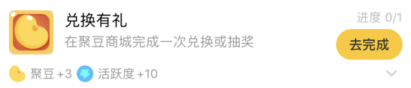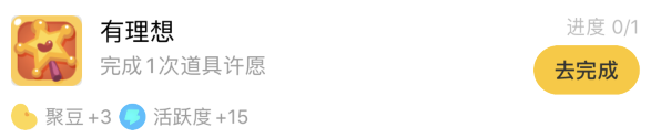 一、每日任务每日任务为每天可完成1次,完成后可获得对应的聚豆。目前任务难度下调,完成35点活跃(开黄金宝箱)仅需1分钟。1、有理想完成条件:点击“有理想”任务后面的去完成,在页面上选择一个游戏,然后随便选个道具许愿即可完成。获得奖励:聚豆3个、活跃度10点