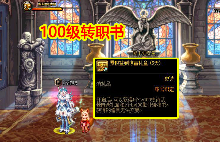 3、100级转职书,保证回坑率。许多玩家都是为了转职,才回坑的。比如之前的似雨幽离,都是毁号了,但是100级的剑魂拿到了高增幅装备之后,直接选择回归,可谓是非常及时。