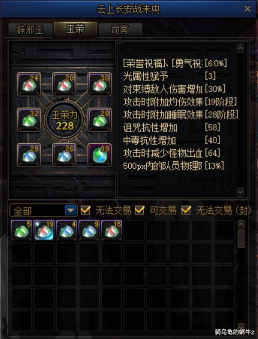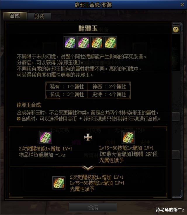 第二个:辟邪玉,击杀怪物和领主均可掉落,品级分为稀有、神器、传说和史诗四种,掉落的有封装和无法交易的类型,稀有仅有1个属性词条,每提升1个品级增加1条,史诗最多4条。辟邪玉可以在怀隐商店进行合成和封装操作。