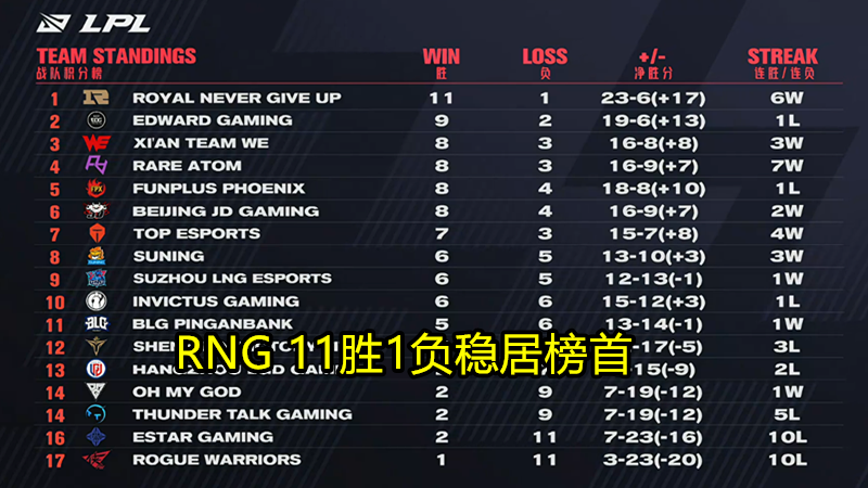 而这场比赛后RNG则是以11胜1负的成绩稳坐LPL榜首,成为了赛区真正的霸主。而ES则是继续进行着连败的纪录,如今10连败的ES战队只能跟RW争倒数第一了。