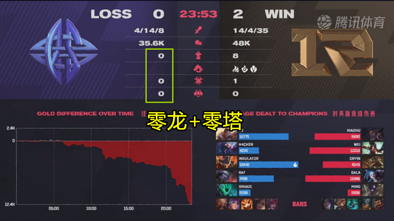而随后的比赛就尴尬了,因为RNG前排有牛头和鳄鱼顶着,所以RNG战队可以一直利用手长的优势疯狂poke。然后ES战队选手又菜,导致完全开不到RNG后排的任何选手,所以就一直被RNG压着打,最终这局比第一局还要惨,24分钟不到就被RNG拿下,并且这局比赛打出了零龙+零塔+零峡谷先锋的耻辱数据。