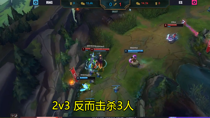 回顾这场对决,最让人难忘还是RNG的上野组合,第一局:RNG在下路先失一血的情况下,打野wei是直接来上路帮小虎反gank了一波。ES本来是准备抓小虎的,结果这波3打2反而被小虎拿到一个人头,wei也是拿到两个人头,ES从这里开始也是直接天崩开局了。